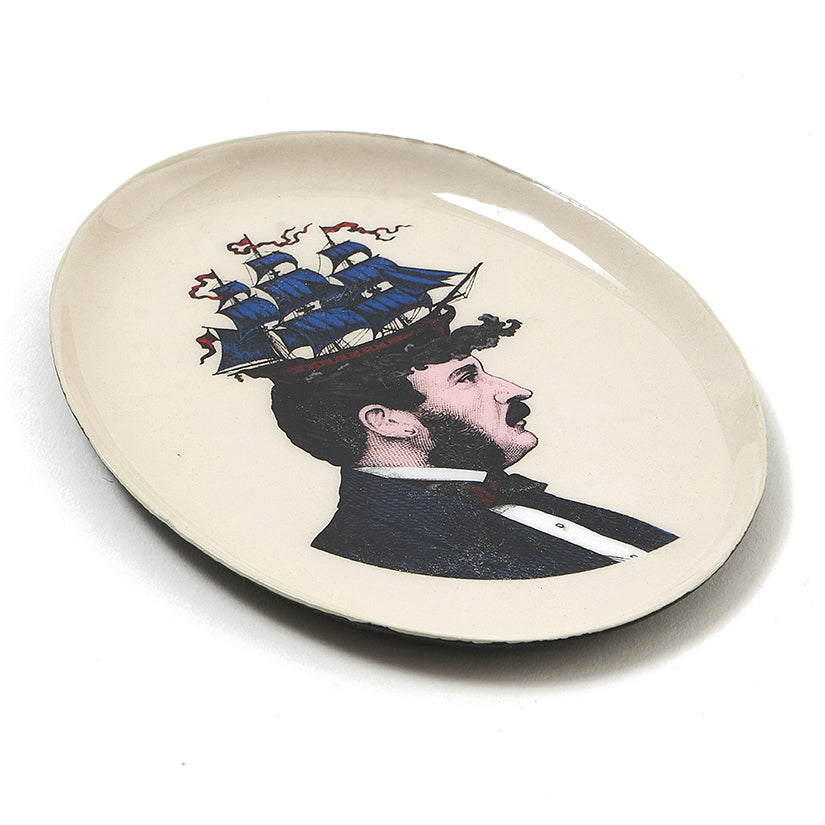A whimsical voyage awaits! This trinket tray features a distinguished gentleman in a tuxedo, his hair adorned with a majestic schooner ship. A playful nod to the voyage of the mind, this piece is perfect for holding trinkets or adding a touch of whimsical sophistication to your decor.