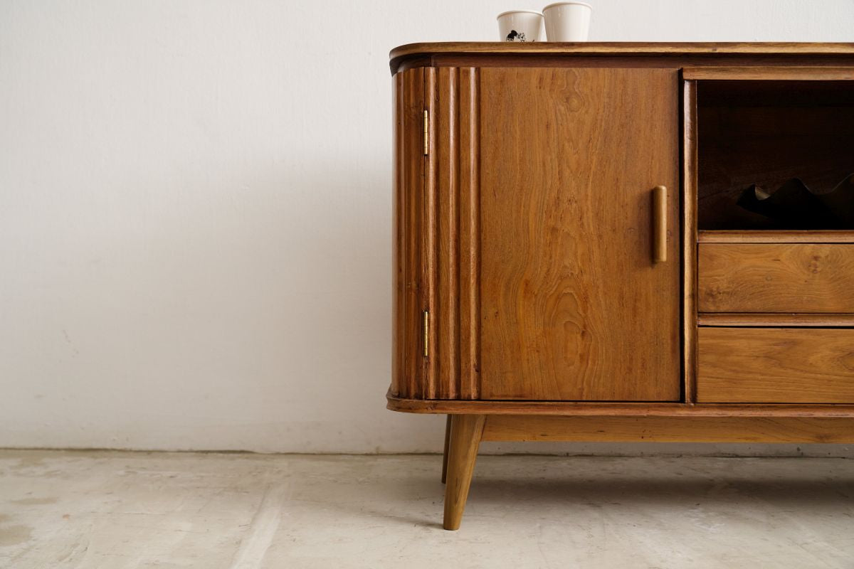 A sophisticated blend of eras: this elegant Retro Curved Sideboard showcases bold mid-century lines infused with a sophisticated Art Deco influence and a subtle nod to the Streamline Moderne aesthetic.