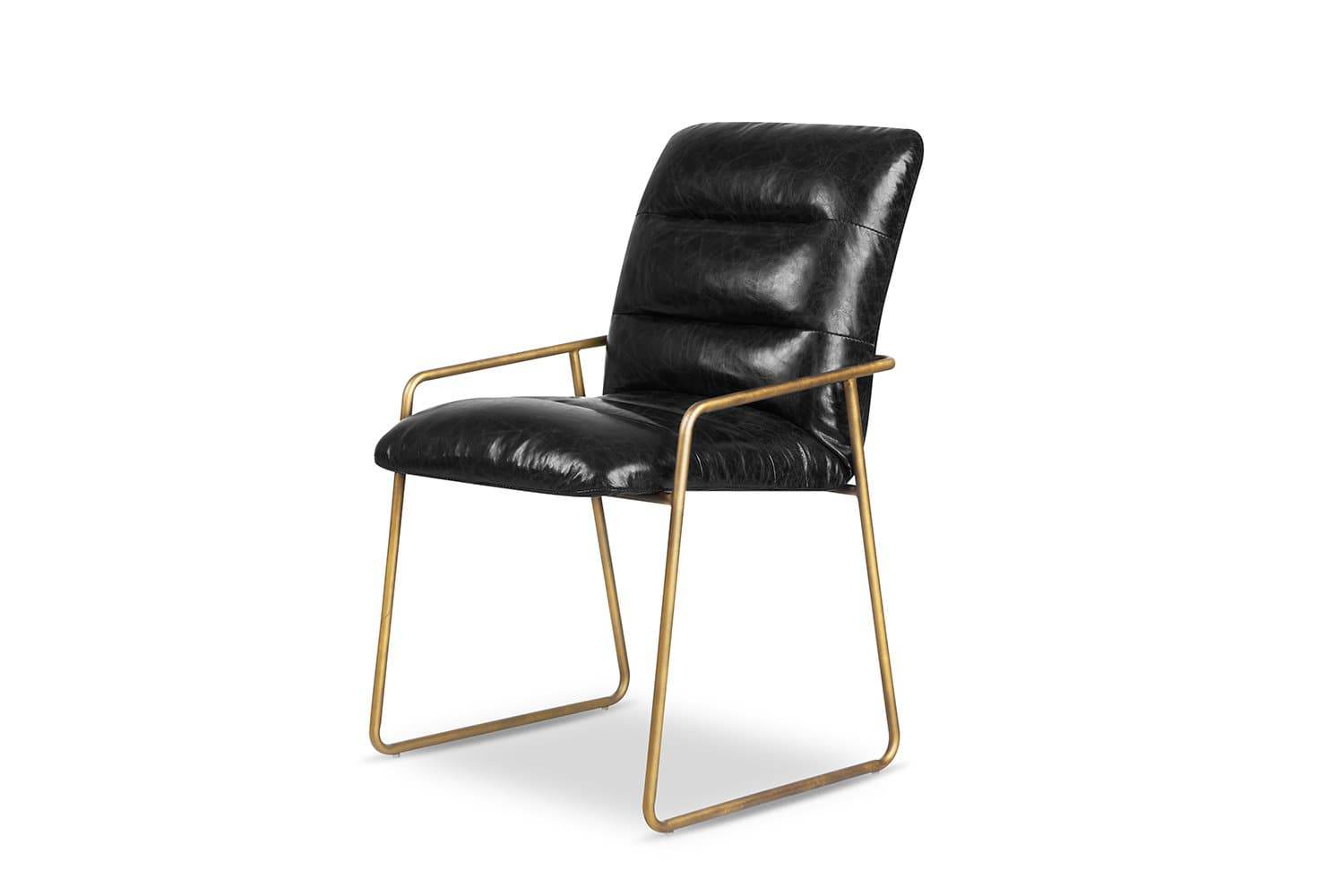 Elevate your dining experience with the United Strangers Dewey Dining Chair, a stunning blend of Art Deco and Modernist design. Featuring a sleek brass-toned metal frame, luxurious channel-back cushioning, and premium top-grain leather upholstery, this chair is a sophisticated statement piece for contemporary dining rooms.