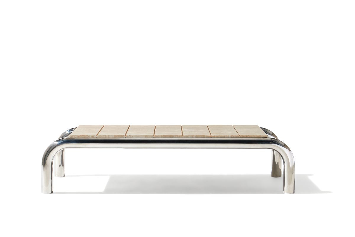 Materials: Matte Ivory Travertine Marble Table Top with Slots Detail, Polished Stainless Steel Frame