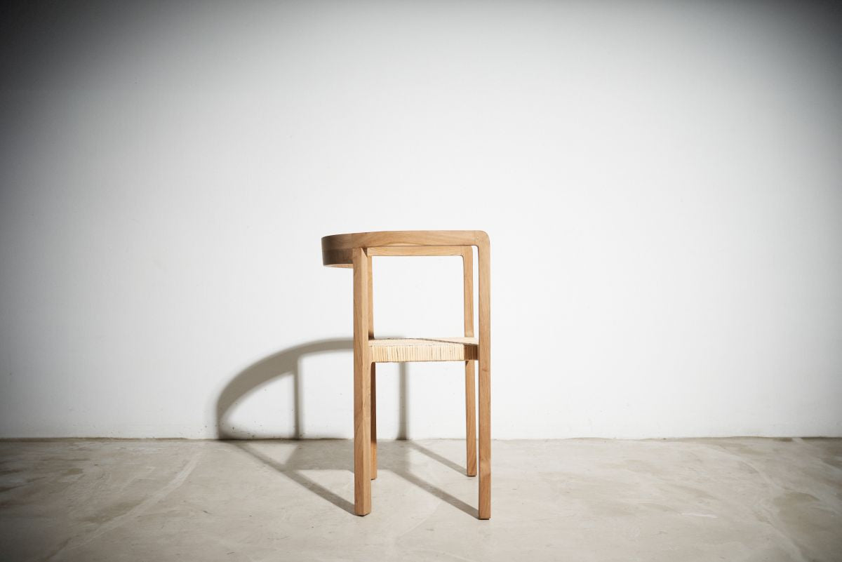 The Vara Chair combines sculptural elegance with contemporary craftsmanship in a compact, graceful design. This modern dining chair features a sweeping rounded backrest that seamlessly flows into sturdy teak wood legs, creating an organic and grounded aesthetic. The front legs maintain a clean linear orientation while the back legs feature an angular design for subtle visual interest.